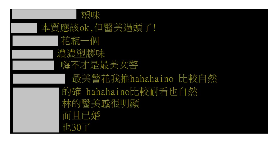 然而,也有不少網友認為「Angel Lin」有著濃濃的「塑膠感」,暗指她做了醫美手術,更拿出過去曾在表特版上造成網民爆動的最正女警「hahahaino」與她做比較,毒舌直言「最美警花我推hahahaino比較自然」「hahahaino比較耐看也自然,林的醫美感很明顯,而且已婚」「嗨不才是最美女警」「本質應該ok,但醫美過頭了!」「濃濃塑膠味」,只能說青菜蘿蔔各有所好,各有各的美啦!