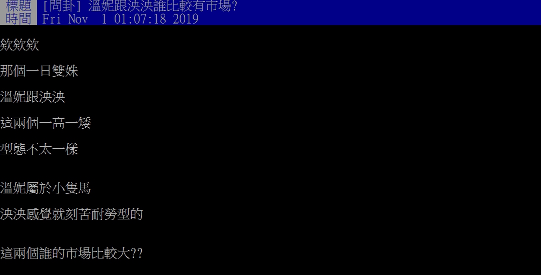 然而近日有網友在PTT問卦「溫妮跟泱泱誰比較有市場?」,文章中指出,溫妮屬於小隻馬,泱泱則比較像刻苦耐勞型,型態不一樣,因此想詢問誰的市場比較大?