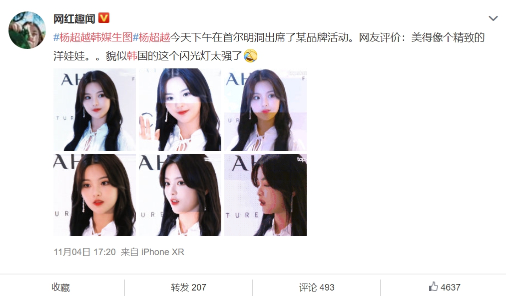 大陸當紅女團「火箭少女101」2018年從騰訊選秀節目「創造101」出道,其中成員「楊超越」自從節目期間以及出道以來,一路都充滿著高人氣與極高話題性。日前她出席在韓國首爾中區舉辦的品牌明洞旗艦店開夜活動,現場韓國媒體照片釋出,她的超白皙皮膚與精緻大眼引起網友討論,無P圖美貌讓人大讚有如洋娃娃!