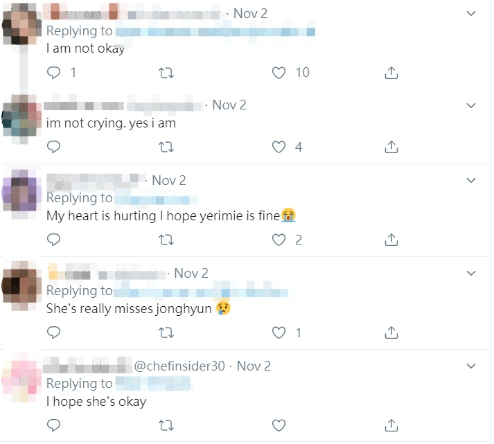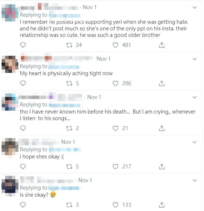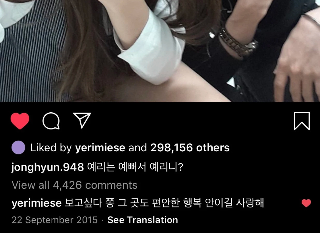 在10月底時,有粉絲注意到Yeri到鐘鉉instagram裡的兩人合照上按讚,並且留言「我想你,希望您感到舒適和快樂,我愛你。」令粉絲十分不捨又擔心,也紛紛在推特上留言表示「我的心好痛,我希望Yeri好好的」、「她真的很想念鐘鉉」、「我希望她還好」、「我覺得好難過」、「他們的關係真好,他是一個好哥哥」。