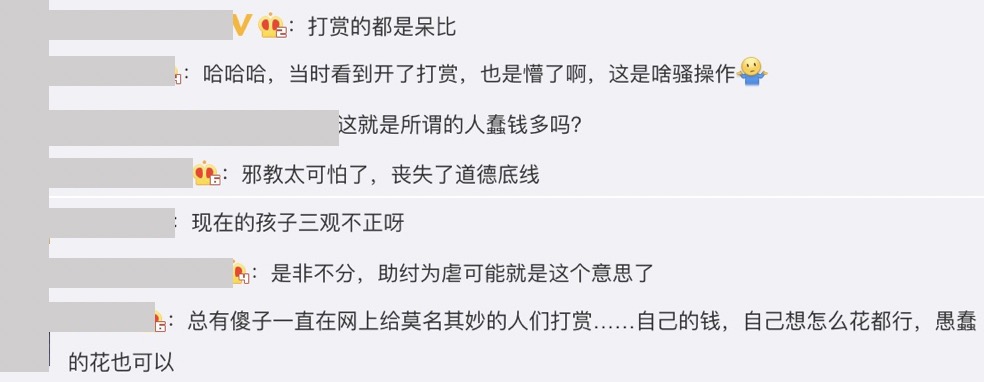 而該長篇解釋文總共有9569萬人次的閱讀,其中有眼尖的網友發現PGONE這篇貼文收到網友總共2835次的打賞,排名第一名的網友一次就打賞2000人民幣(約8600台幣)給PGONE,更有人粗估這篇貼文吸金近百萬台幣,對此許多網友也傻眼的表示:「是非不分,助紂為虐可能就是這個意思了」、「總有傻子一直在網上給莫名其妙的人們打賞……自己的錢,自己想怎麼花都行,愚蠢的花也可以」、「現在的孩子三觀不正呀」。