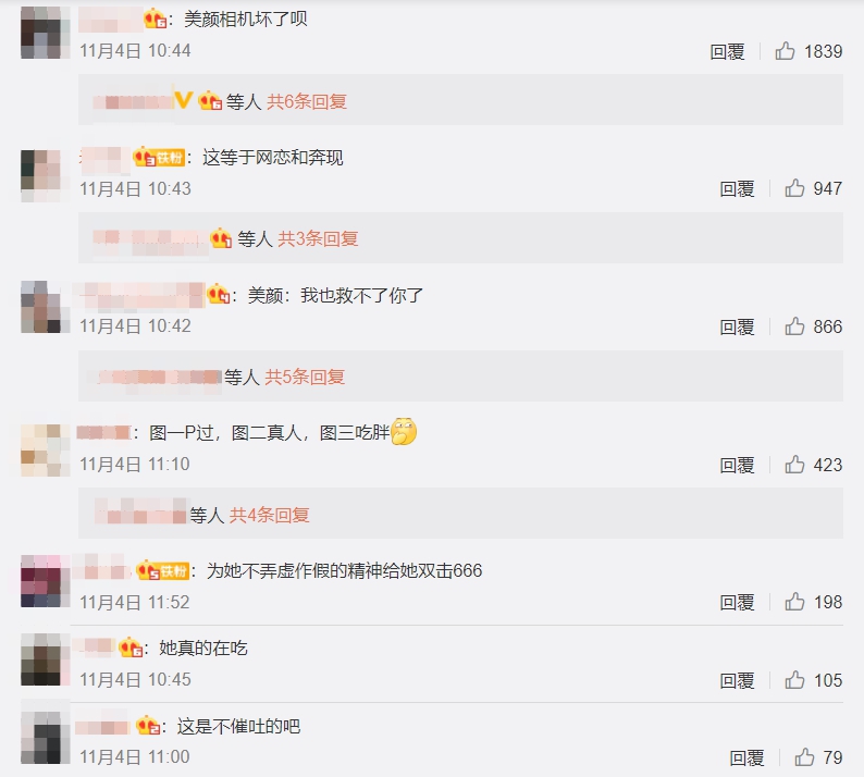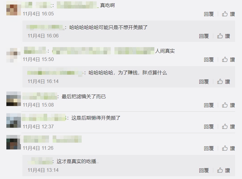 這組直播主吃播一年前後對比差別太大的照片引起網友熱議,紛紛留言「這是真吃啊」、「哈哈哈可能只是不想開美顏了」、「她真的在吃」、「美顏相機壞了唄」、「不是同一個人吧」,還有人搞笑表示這前後差別過程有如「網戀奔向現實」。