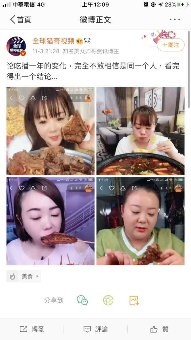 不過近日在微博上,有網友po出幾張照片,內容是某位直播主吃播以來一年前後的變化對比,只見照片中的直播主一開始本是相當尖細的下巴,一年後變的圓潤,逐漸腫了一大圈,整個人都發福了起來,幾乎令人不敢相信這是同一個人。據了解,這位吃播前後身材反差超大的直播主在大陸著名短影片APP「快手」上的ID名叫做「大夢夢紀錄美食」,經常與粉絲直播分享吃東西,她吃過的美食幾乎都是體積很大、分量很多的食物,包括大羊排、大雞腿、紅燒排骨等,大口享受美食的模樣頗為療癒。