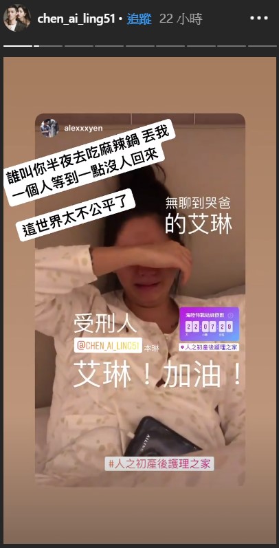 藝人陳艾琳,在上月21日生下了健康的女兒「顏蘵」,而正在產後中心休養的她,也經常分享自己初為人母的生活。最近因為老公Alex(顏庭笙)半夜跑出去吃麻辣鍋,獨自留下她一人在月子中心,讓陳艾琳委屈地躺在床上爆哭,結果這爆哭的畫面竟被老公Alex拍下來上傳到IG的限時動態上,如此逗趣的互動,也引起了網友們的熱烈關注!