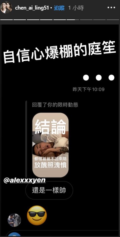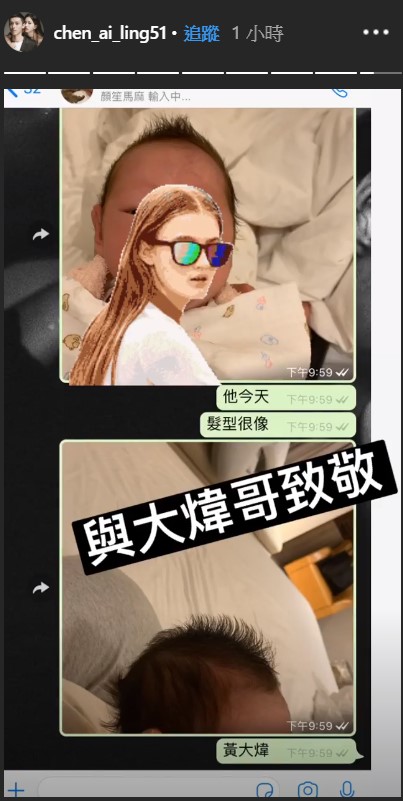 事隔沒多久,陳艾琳又接著上傳了一張Alex的醜照來洩憤!沒想到Alex看到醜照竟回「還是一樣帥」,讓陳艾琳直呼「自信心爆棚!」,之後也貼出老公與女兒溫馨玩耍的畫面,以及女兒的照片,從照片中可以看出女兒的頭髮順著頭形豎了起來,陳艾琳幽默的說,好像藝人黃大煒的髮型,開玩笑的說「像大煒哥致敬!」讓網友們看了都覺得好有趣。