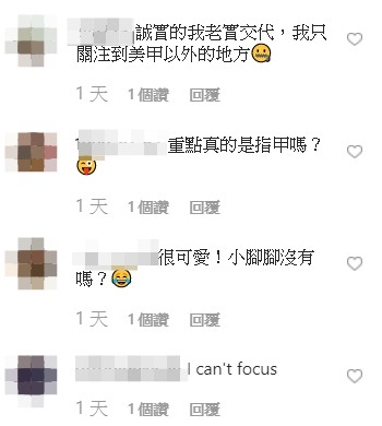 陳伊貼出照片後,引來2萬多名粉絲按讚,另外也有許多人紛紛留言表示「好深」、「我眼睛都只看到胸」、「重點真的是指甲嗎?」、「失焦了...」、「誠實的我老實交代,我只關注到美甲以外的地方」,而陳伊則開玩笑寫下,「拜託認真看一下我的指甲嘛」。