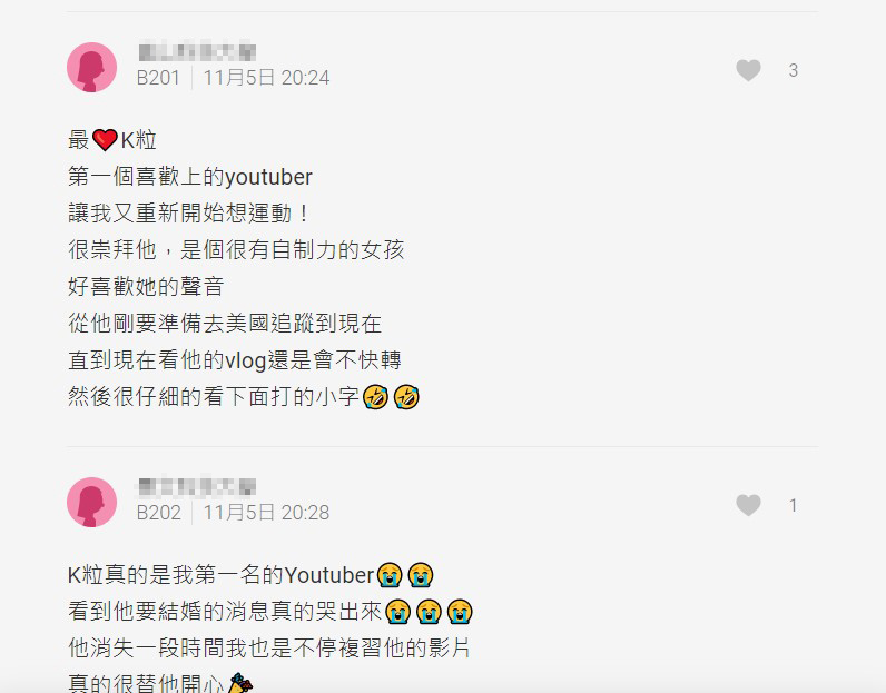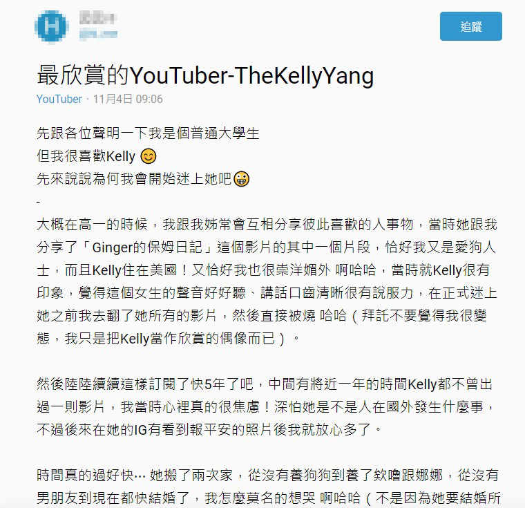 近日有網友在Dcard上分享「最欣賞的Youtuber」,原PO在文中表示自己最欣賞的便是「TheKellyYang」。原PO還沒當上粉絲前,就被Kelly的聲音吸引,加上Kelly講話口齒清晰很有說服力,讓原PO看完所有影片後立刻成為粉絲。同時原PO也細數Kelly在Youtber生涯中,搬了兩次家、領養了兩隻狗、交了男朋友以及最近公布了喜訊要結婚了,讓原Po感嘆直呼「我怎麼莫名的想哭」。