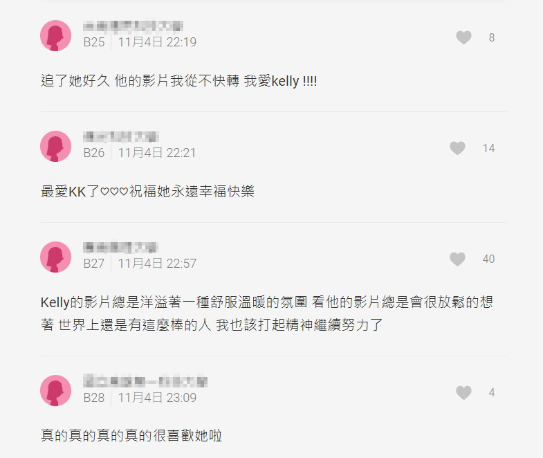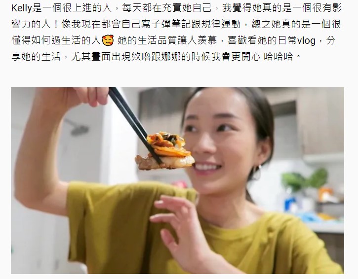 原Po更對於Kelly的上進以及規律運動,稱讚是個非常有生活品質的人,令人十分羨慕向她看齊。文章一出,引來不少網友留言紛紛表示,「Kelly的影片總是洋溢著一種舒服溫暖的氛圍,世界上還是有這麼棒的人,我也該打起精神繼續努力了」、「追了她好久,她的影片從不快轉!」然而此篇文章200多則留言當中,幾乎沒有負評,可說是youtuber界一股清流。