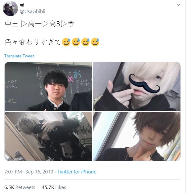照片中,該名網友在國三時期穿著一般日本國中生的制服,臉龐較為圓潤,臉上也有許多青春期特有的痘疤,明顯是個單眼皮,渾身上下都充滿了「肉肉感」,看起來個性憨厚老實,是個不折不扣的普通國中男生。不過從高一開始,照片便慢慢出現變化,這名網友似乎學會了打扮,風格逐漸往花美男發展。