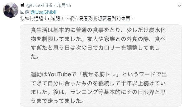 該名網友透露,自己國中時遭到霸凌,所以決定開始減肥,也曝光自己減肥成功的祕訣。他表示,飲食維持一般的習慣,並控制碳水化合物的攝取,搭配上持之以恆、適合自己的運動,自然而然就瘦了下來。除此之外,該名網友也向網友解釋,皮膚會變的光華是透過飲食控制,而自己會變成雙眼皮是透過雙眼皮膠的幫助,更表示鼻形會變得細長,是因為有鼻影加上美顏APP的關係,強調自己沒有整型。