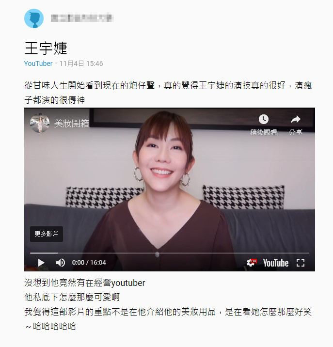在大學生論壇「Dcard」中,近日有一名網友分享,自己從《甘味人生》開始認識了演員王宇婕,一直到現在的《炮仔聲》對於她的演技感到非常厲害,就連演「瘋子」都難不倒她,讓原PO吃驚的是,王宇婕竟然也有經營Youtube,成了時下最夯的職業Youtuber。有別於劇中形象,王宇婕私下十分幽默可愛,也令原PO大力讚賞。
