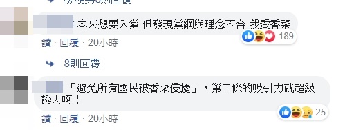 一年的議員經歷,讓呱吉有感而發,為了改變現況,期盼在大家呼吸的空氣中,充滿快樂因子,因此呱吉決定組成「歡樂無法黨」,並訂下六條黨綱,其中也用不少「香菜梗」,因此也引來許多人笑翻留言,「香菜錯了嗎」、「唯一支持香菜」、「為什麼這麼多元歡樂的黨還是要排擠無辜的香菜」。