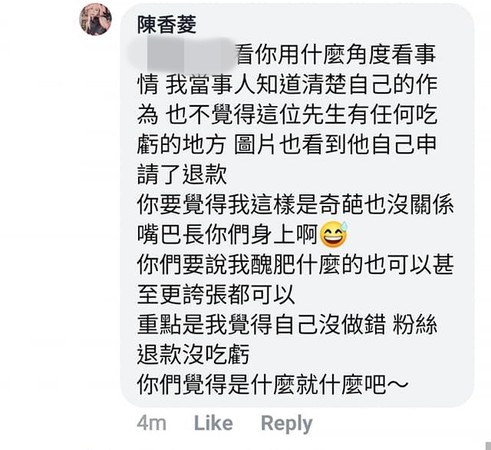 陳香菱也在第二則留言中表示:「我當事人知道清楚自己的作為,也不覺得這位先生有任何吃虧的地方」,她更是指出圖片上,該網友也提出「退款」申請,她也再次坦蕩蕩地強調「覺得自己沒有做錯的地方,況且粉絲也沒吃虧」。