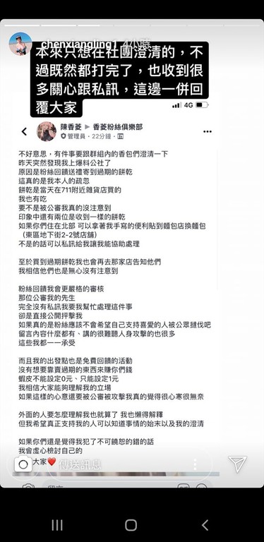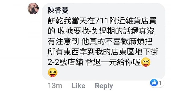 該網友私訊陳香菱要求退費,並把整件事直接PO上爆料公社,讓傻眼的陳香菱馬上留言說,「1塊錢欸先生,我看不懂你在氣噗噗什麼,可見你根本不是粉絲啊!」她又補充解釋,餅乾是當時在雜貨店買的,「收據要找找,過期的話還真沒有注意到!」同時也在回覆中表示,若粉絲真的不喜歡商品,請對方將東西拿到她位於東區地下街的店舖,並附上吐舌圖案調皮地寫道,「會退一元給你喔!」