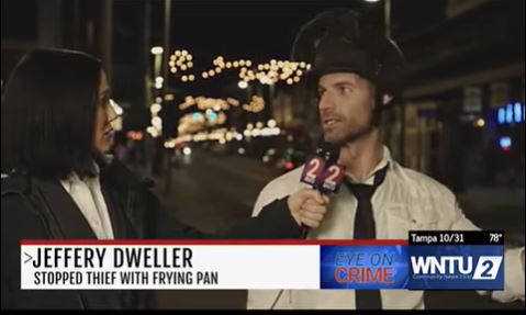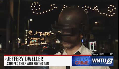 根據美國「田納西電視台」報導,國外有一名男子靠著手裡的平底鍋,成功制伏了一名搶劫犯,影片曝光後,逗笑許多網友,在網上引起一陣譁然!許多國外民眾都會在10月31日萬聖節這天,扮成各式各樣、別出心裁的角色,和朋友聚會、參加活動。當時,身為《絕地求生》忠實玩家的31歲男子「杰弗里·德威爾(Jeffrey Dweller暫譯)」,決定打扮成遊戲中的招牌造型。