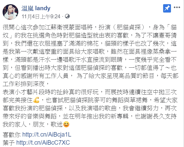 歌手溫嵐近年來事業重心都在大陸,鮮少在台灣公開露面。近來她登上大陸綜藝節目《蒙面唱將猜猜猜》,化身「肥貓偵探」,演唱許多首感動人的歌曲,包含《葉子》、《喜歡你》...等,她那極具辨識度的嗓音跟唱腔,很快地就被大家給猜出身分!不過最讓人驚訝的是,當她拿下面具展現真面目的時候,網友看完都驚呼,「這真的是溫嵐?」。