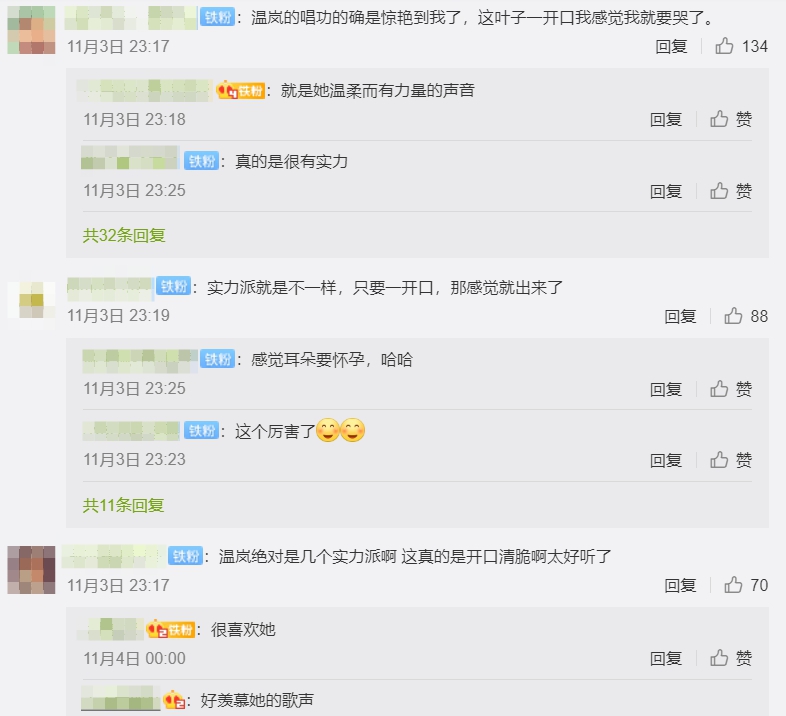 其他網友聽完溫嵐的歌聲之後,都紛紛留言大讚,「溫嵐的唱功的確驚豔到我了,這葉子一開口我感覺要哭了!」、「實力派就是不一樣,只要一開口,那感覺就出來了」、「這真的是開口跪啊!太好聽了!」此外,當她拿掉面具時,許多網友看到她五官的那一瞬間,都不禁留言大喊,「溫嵐怎變這樣!不帶面具我也認不出來啊!」、「溫嵐都變這個樣子了啊...」、「完全認不出那是溫嵐耶」、「揭面的时候嚇我一跳,以前不是長得挺好的嗎?」、「真是一臉難盡的玻尿酸啊……」。