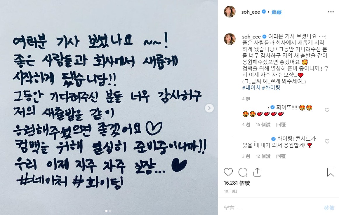 在n.CH娛樂發布金昭希加入的消息後,金昭希也在個人IG以親筆信表示:「非常感謝粉絲耐心配合,希望能得您們的支持我的新開始。我正在努力付出!」證實自己加入NATURE的消息,並獲得原NATURE粉絲熱烈的歡迎。