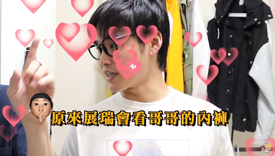 影片後半段來到展瑞的「衣櫃」,和哥哥不同的是,展瑞有完整的一間更衣室,裡面也有華麗的梳妝台等,空間不小。而展榮翻了一下衣櫃後,直接挖出弟弟的「卡通內褲」,更一一敘述上面圖案有鹹蛋超人、米奇、星際大戰,讓展瑞超害羞,也從中看出兩人幽默的互動。