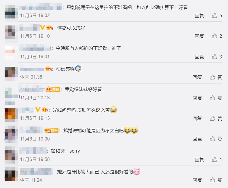 不過卻有網友指出她當天的活動照片有點不太行,紛紛表示「體態可以更好」「光線問題嗎,皮膚怎么這麼黃」「嘴和牙,sorry」「我覺得她可能是因為不太白吧」「只能說底子在這裡拍的不難看吧,和以前比確實算不上好看」「她為什麼搞這麼成熟,日本那種淡淡的味道,不是更舒服些嗎」,但也有網友力挺「我覺得挺好看的」「挺好看的啊,絕對氣質美女啊」「我覺得妹妹好好看」「自信最好看」。