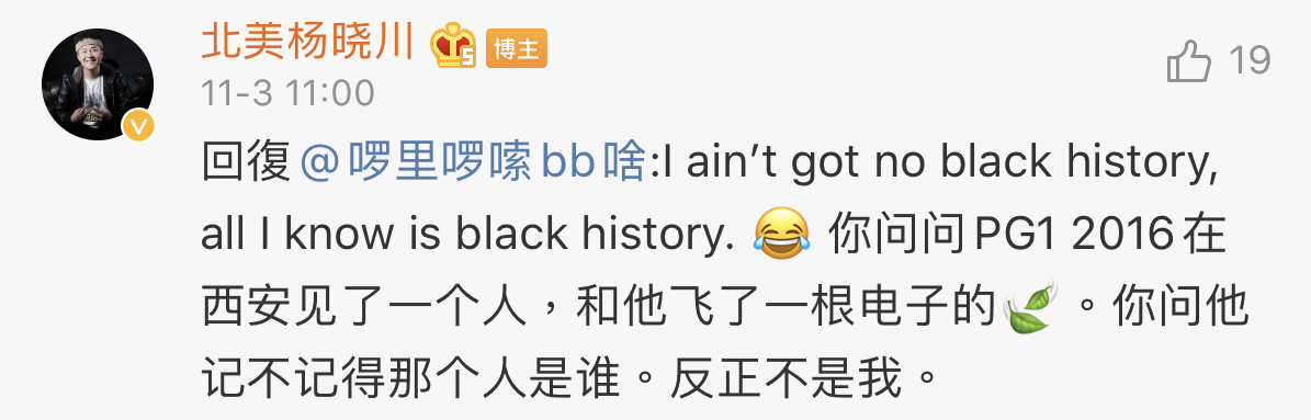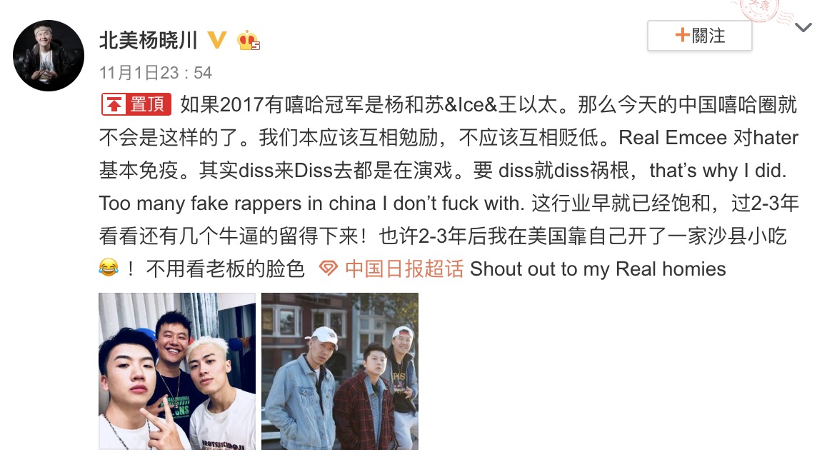 30號下午微博出現了三段PGONE與李小璐的親密影片,兩人除了在鏡子前自拍之外,更穿著情侶裝在沙發上大玩手指舞,接著更在鏡頭前嘴對嘴接吻,宛如熱戀中的情侶,隨後PGONE也在當天發聲明表示影片是在今年3、4月拍的,也承認過去和李小璐有段感情,聲明一出後眾多Rapper也開始發文暗諷PGONE,更有人寫歌開始diss他。在11月1號時,參加過《中國新說唱》的選手「楊曉川」發文表示:「如果2017有嘻哈冠軍是楊和蘇&Ice&王以太。那麼今天的中國嘻哈圈就不會是這樣的了」,更在留言區中回應網友時提到:「你問問PG1 2016在西安見了一個人,和他飛了一根電子的(大麻菸)」,抖出PGONE曾吸毒的黑歷史。