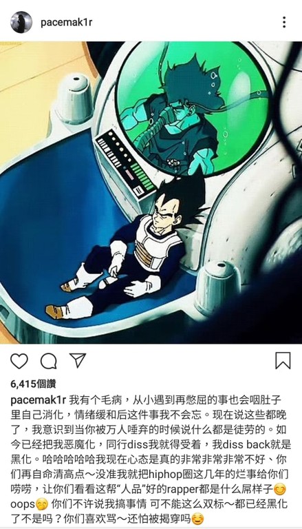 然而當PGONE發完微博長文後,轉至IG上抒發個人情緒,寫下:「同行diss我就得受著,我diss back就是黑化」,更提到自己現在的心情非常不好,表示:「你們再自命清高點~沒準我就把hiphop圈這幾年的爛事給你們嘮嘮,讓你們看看這幫『人品』好的rapper都是什麽屌樣子」,言詞間對落井下石的Rapper們感到非常不滿。