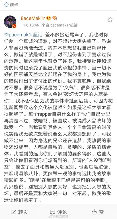 而在11月6號時,PGONE再次於微博上發文寫下:「差不多接近尾聲了,我也對你們差一個真誠的道歉,對不起讓大家失望了」,也提到這兩年來他背負與經歷了許多超出他能負擔的事情,也表示自己「不聰明,但絕對不惡」,隨後說到「每個rapper自身什麼樣子,他們自己心裡再清楚不過,被唾罵、被圍攻、被說成人品敗壞的就我一個」,更爆料很多毀三觀的事情遠比他的事精彩許多。