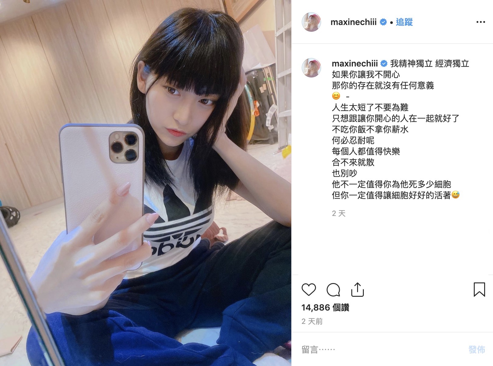 祈錦鈅5日在IG上曬出一張自拍照,並發文寫下類似心靈雞湯的話語:「人生太短了不要為難,只想跟讓你開心的人在一起就好了、「他不一定值得你為他死多少細胞,但你一定值得讓細胞好好的活著」,而畫面中她穿上一套運動裝並盤腿坐在地上,對著前方大片鏡子自拍時也被眼尖的網友發現她原先招牌長瀏海不見了,轉變成齊眉平瀏海,整個人逆齡了許多,看起來相當甜美可愛。