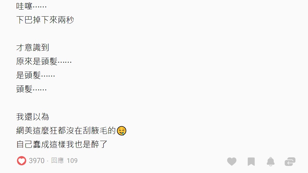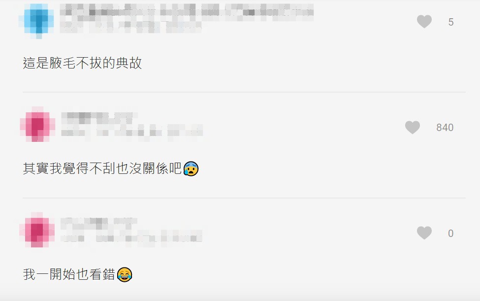 貼文一出立即引發網友熱議,紛紛在貼文底下留言,「第一眼真的會看錯⋯」「笑死」「超級像的...」「第一眼超像沒刮」「笑死XDDD看錯完全回不來」「哈哈 害我一直滑回去看那張圖」「嚇到我了我還以為,什麼會有這麼濃密的黑森林!!…………」「這是腋毛不拔的典故」。