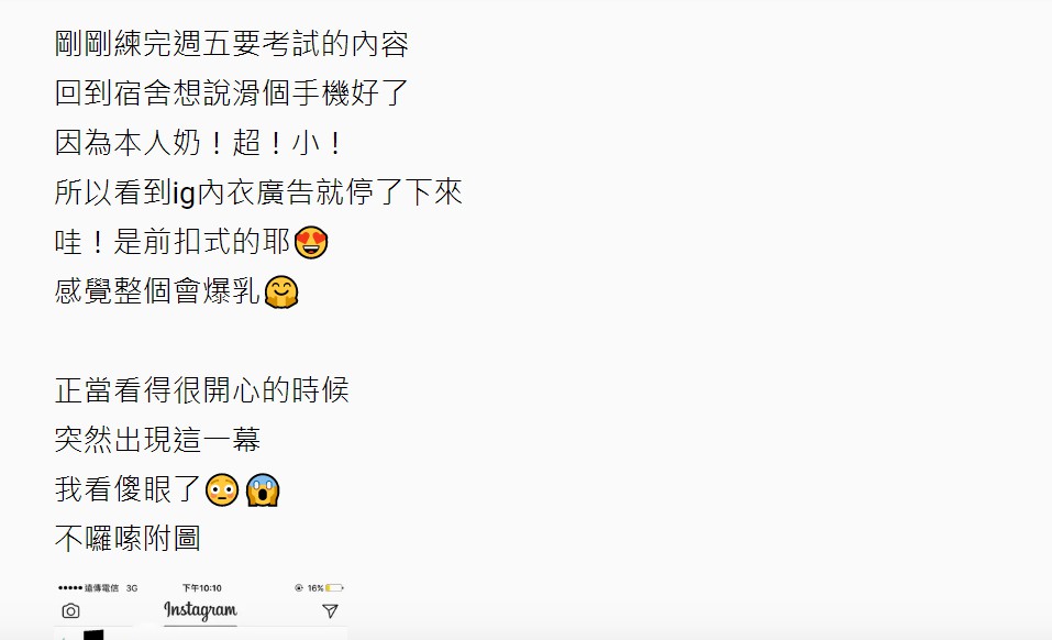 日前有女網友在Dcard上發文,表示自己滑手機時滑到內衣廣告,由於她本身「奶!超!小!」,因此便被某個內衣廣告吸引了目光,廣告裡的模特兒展示著內衣的前扣式功能,正當她心嚮往之覺得「哇!感覺整個會爆乳」的時候,卻被模特兒的腋下吸引了目光,只見那裡竄出了一大片「黑森林」!看到這個畫面,該位女網友當場傻眼「哇噻⋯⋯下巴掉下來兩秒」,還好她愣了一下立刻反應過來,模特兒腋下竄出來的一片其實只是頭髮,讓她鬆了一口氣,笑說「我還以為,網美這麼狂都沒在刮腋毛的。自己蠢成這樣我也是醉了」十分逗趣。