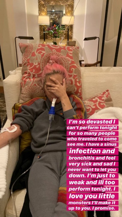 去年12月開始,女神卡卡重拾本業,再度展開《Enigma》駐點演出,原訂一共32場表演,再加上一場「安可」,要一路唱到明年5月。因為行程緊湊,近期她馬不停蹄,在美國展開一連串演出。不過也許是過於操勞,女神卡卡的身體開始出現問題,最後因為生病而不得不臨時取消演唱會。7日時,她在社群網站上更新自己的近況照。照片中,女神卡卡摀著自己的臉,嘴巴含著呼吸器,手上則還吊著點滴線,看起來相當虛弱,而她也難過地發文向粉絲們表示:「我真的很沮喪,有這麼多的人特地來看我,我卻因為鼻竇炎和支氣管炎不能表演」透露自己狀態不佳,感到十分不適又非常難過,「我真的不希望讓大家失望,但我虛弱到沒辦法進行今晚表演」,並承諾她的粉絲們,自己一定會盡力補償。