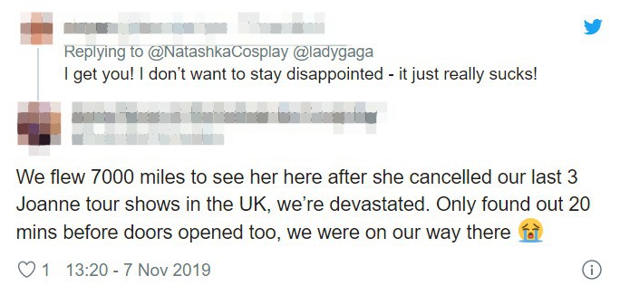 雖然女神卡卡的道歉相當有誠意,但是不少歌迷對於她臨時取消表演,似乎還是難掩失望。消息一出後,陸續有歌迷在社交平台上,表示自己相當難過:「我在8月18日拿到了門票後,就一直盼望著今晚,已經等了整整一年」、「真的很傷心」。