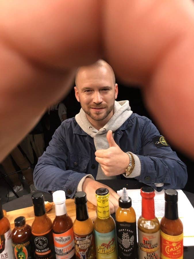 而保羅路德也相當大方地承認,表示自己確實有這個怪僻,喜歡拍攝名人看似站在屁股或是「蛋蛋」前的借位照。而他也大方接受克理斯瓦爾德的請求,在現場展露了這項獨門絕技。保羅路德手法熟練,非常快速地在手機鏡頭前屈起手指,很快地就完成了這張「露屁股蛋蛋照」。