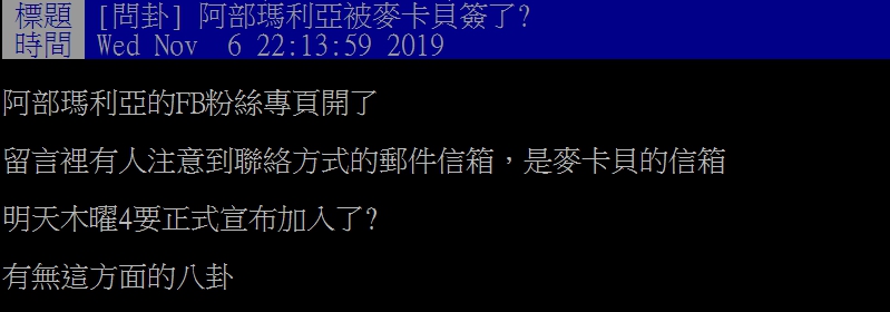 日前有鄉民在PTT中問卦,「阿部瑪利亞被麥卡貝簽了?」內文中則提到,阿部馬利亞開了粉絲專頁,而聯絡方式中的郵件信箱,是麥卡貝的信箱,因此該網友詢問,「木曜4要正式宣布加入了?有無這方面的八卦?」