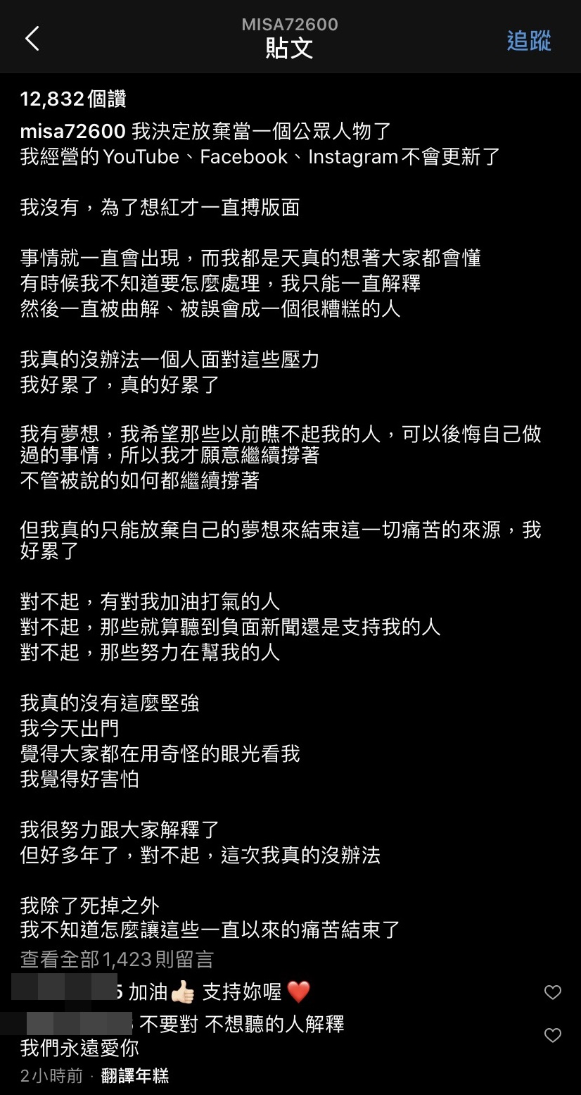 米砂在IG上投下震撼彈,之後她所經營的YouTube、Facebook、Instagram不會再更新,同時她也表示,「事情一直出現,我天真的想著大家都會懂,有時候我不知道要怎麼處理,我只能一直解釋,然後一直被曲解、被誤會成一個很糟糕的人。」