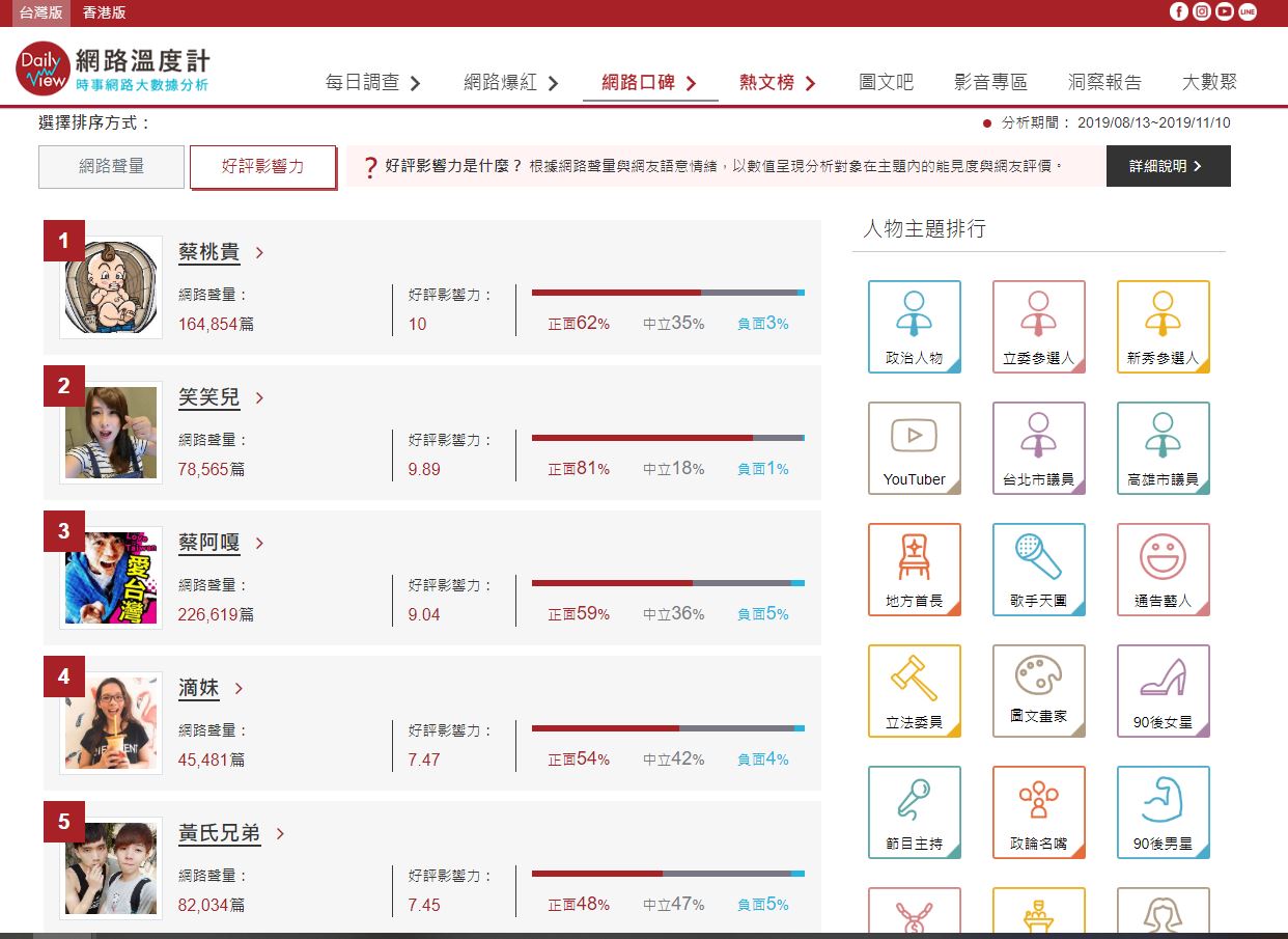 近日,《DailyView網路溫度計》依據《KEYPO大數據關鍵引擎》所提供的巨量資料庫統計出了最具「網路聲量」和最具「好評影響力」的YouTuber,其中在「好評影響力」的排行中,由蔡桃貴、笑笑和蔡阿嘎拿下了前三名,滴妹和黃氏兄弟的分別為第四和第五名。