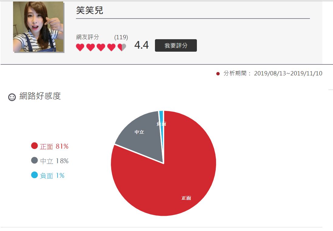 此次的統計期間是從八月十三開始,至十一月十日截止,為期三個月。最終,蔡桃貴在統計中拿下了滿分的數值10分,而「笑笑」則以0.8數值之差,贏過蔡阿嘎,拿下了第二名,「笑笑」在網路好感度方面,約有百分之八十的網民對她是持有正面觀感的,其中只有百分之一的網民給予負面的評價。