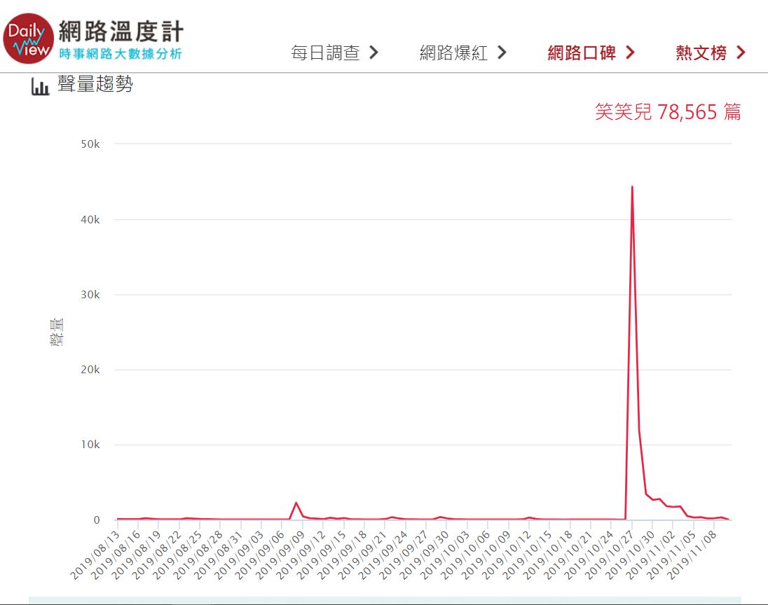 而在社群的活躍度中,儘管「笑笑」的社群關注則數和新聞媒體則數,都沒有蔡桃貴和蔡阿嘎來得多,但「笑笑」的網路聲量趨勢卻出奇地高,擁有多達44萬筆的討論度,十分驚人,而實際找到獲得最高討論度的一天,則是小玉發布影片「想買就買!讓笑笑瘋狂買爆一天!?」當天,可見影片討論度極高,帶動整個網路話題。