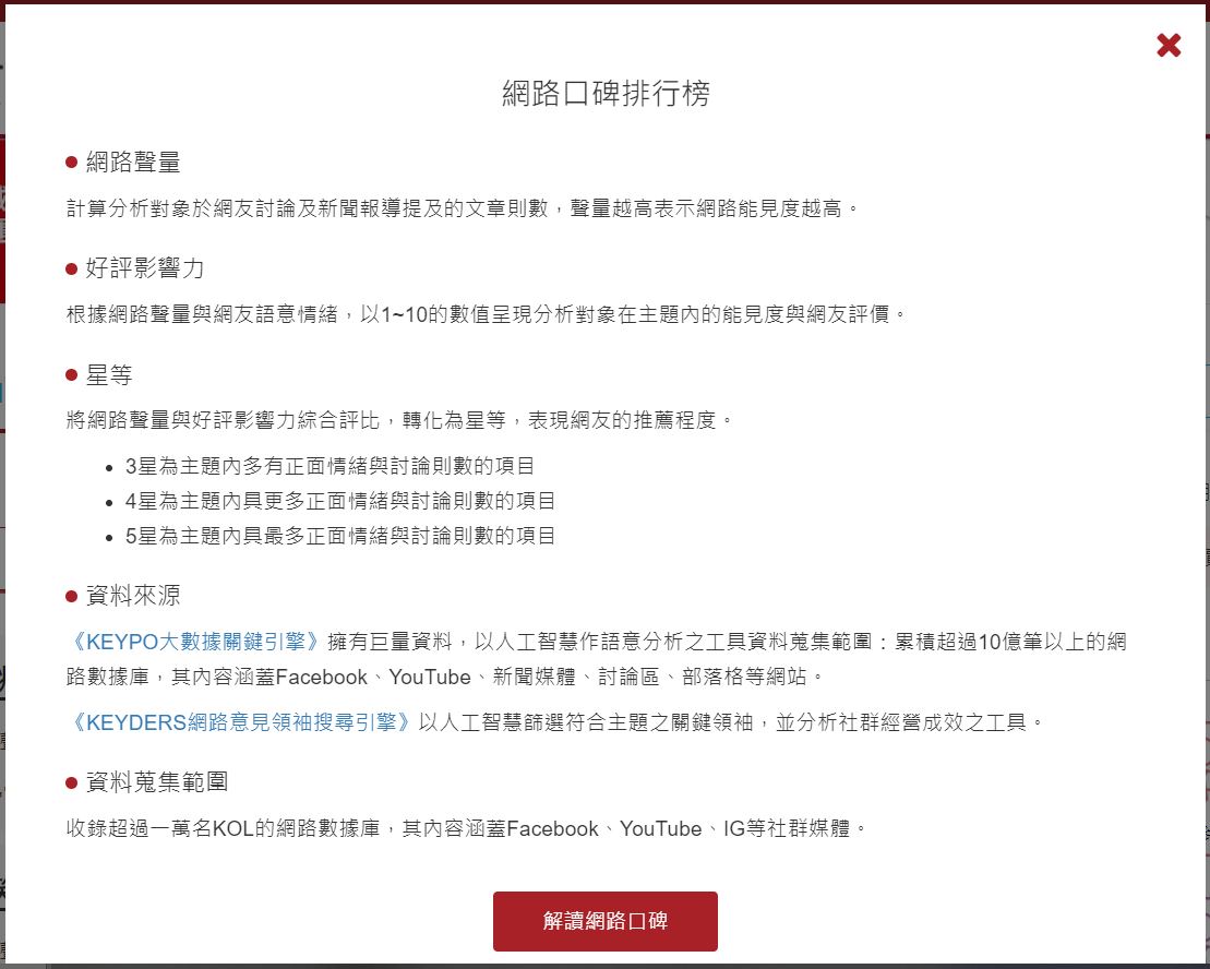 此項統計中的「網路聲量」、「好評影響力」則分別指「計算分析對象於網友討論及新聞報導提及的文章則數,聲量越高表示網路能見度越高。」、「根據網路聲量與網友語意情緒,以1~10的數值呈現分析對象在主題內的能見度與網友評價。」,簡而言之,「好評影響力」就是網友對於Youtuber的新聞、文章所給予的評價,擁有越多正面評價,「好評影響力」的分數就越高。