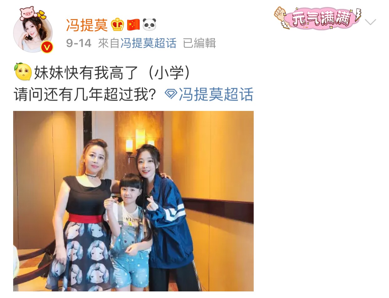 然而9月14號時馮提莫也在微博分享自己和家人的合照,連同媽媽也一同驚喜的入鏡,身形嬌小的她當天身穿一件寬鬆的藍色長版外套,下半身則是搭配一件黑色長褲,並在頭上綁上兩根辮子,對著鏡頭比出愛心的手勢看起來相當年輕。然而一旁的小妹穿著打扮也相當可愛,神韻也和馮提莫非常相似,而馮提莫除了曬照外也發文寫下:「妹妹快比我高了,請問還有幾年超過我?」,目前僅國小的妹妹身高接近150公分,相當驚人。