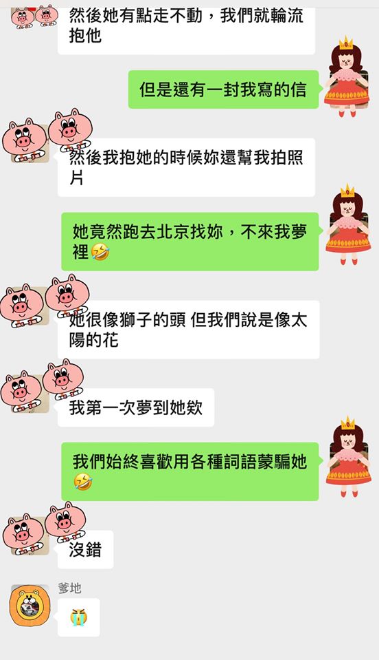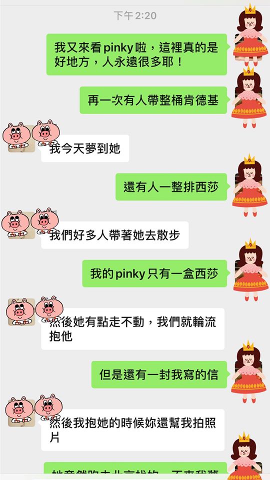 Selina也跟妹妹任容萱分享她去看Pinky時看到的場景,結果任容萱居然說她其實已經夢到Pinky了!同時還開心的說,這是Pinky第一次到她的夢裡,「我今天夢到她,我們好多人帶著她去散步,然後她有點走不動,我們就輪流抱她,然後我抱她的時候妳還幫我們拍照。」讓Selina好氣又好笑的說,「她竟然跑去北京找妳,不來我夢裡!」連任爸看了也丟出一個哭哭的表情XD