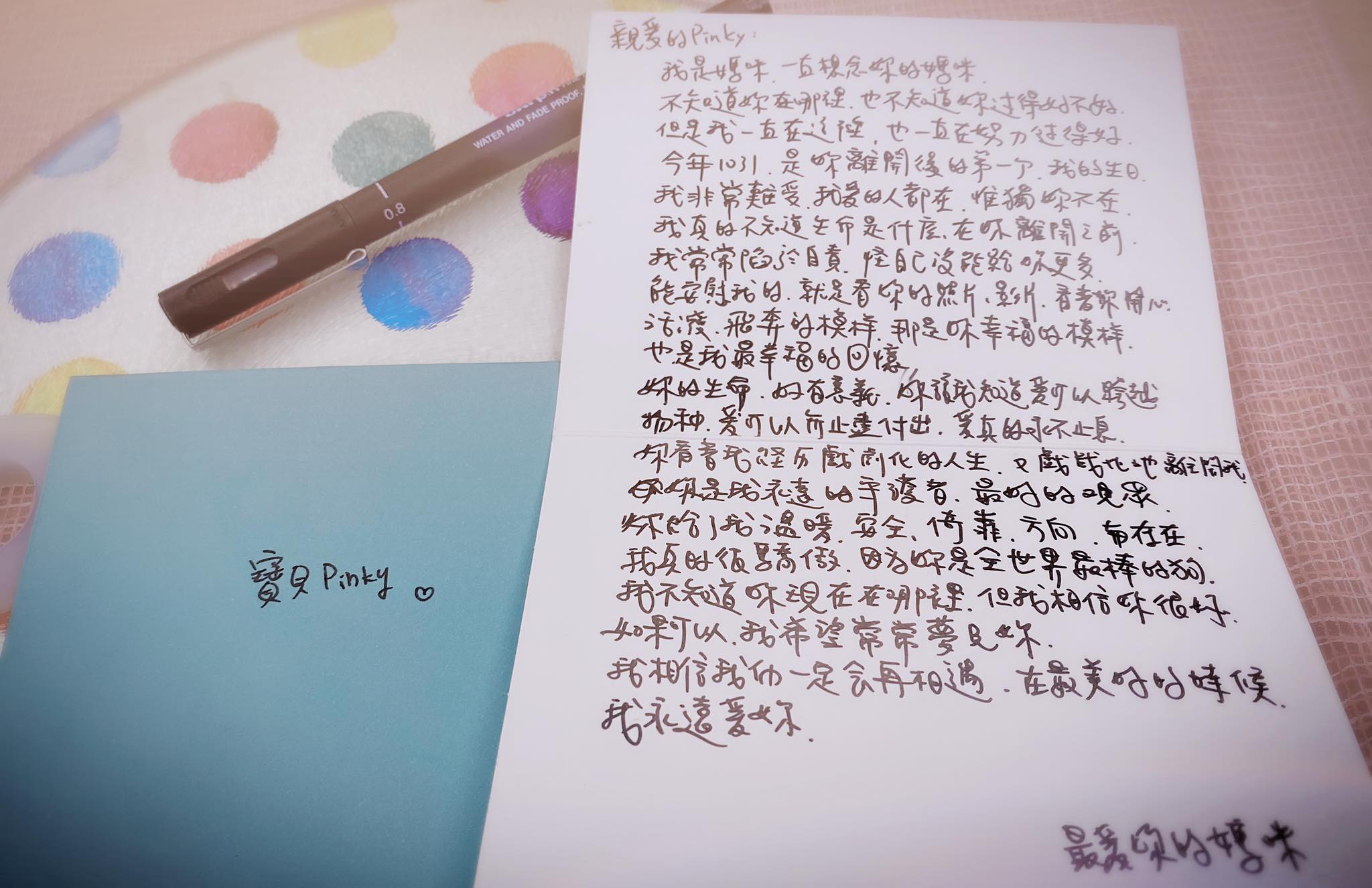Selina最近在臉書PO出一封手寫信的照片,我們從照片中可以看到,她坦承今年的生日過得很難受,「我愛的人都在,唯獨妳不在!」她還寫道,「我真的不知道生命是什麼,在妳離開以前,我常常陷於自責,怪自己沒能給妳更多」,話語之間流露出濃濃的自責與疼惜,「能安慰我的,就是看妳的照片、影片,看著妳開心、活潑飛奔的模樣,那是妳幸福的模樣,也是我最幸福的回憶!」,字裡行間溢出對Pinky的思念,讓人看了都覺得好心疼!