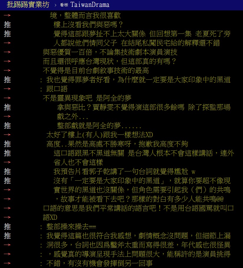 而且劇中為了強調黑道幫派的生活,「台詞很容易莫名其妙簡化,或是出現詩詞和文言文,但下一秒又出現髒話,一直操來操去的,聽得很膩!」網友們一致認為台灣黑道不會只說「操你媽!」而是應該更道地的說「X你娘」才對呀!