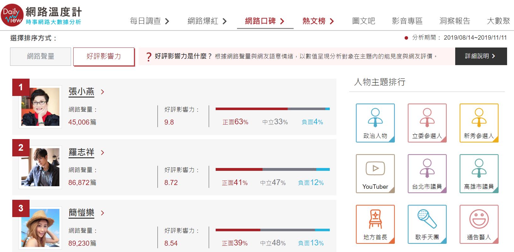 在這次的「好評影響力」榜單中,由攻佔年輕人族群的小豬「羅志祥」和可愛的「愷樂」取得了第二和第三名的位置,而第一名的寶座則是由近期獲得終身成就獎的「小燕姐」奪得,「小燕姐」以著網路好感度過半的局面,獲得了大多數人的喜愛,實至名歸!