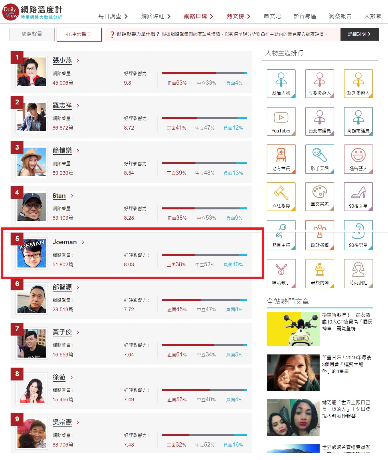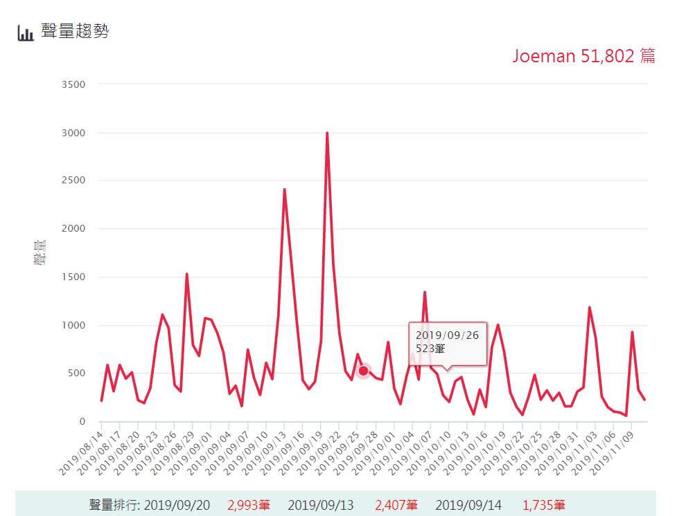 在過去近三個月來「Joeman」不論是在社群的活躍度,像是社群關注則數、新聞媒體報導則數,還是網路聲量趨勢上都大幅領先了近期活躍於Youtube圈的阿公「邰智源」,以及剛鍍金的金鐘主持人「黃子佼」,真可謂「長江後浪推前浪」,如今在網路平台也能闖出自己的一片天。