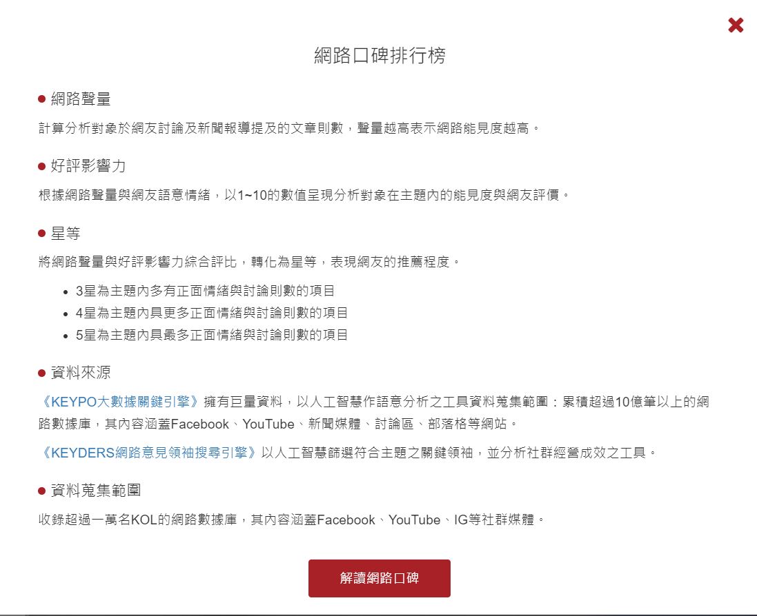 此次的統計調查分為「網路聲量」、「好評影響力」兩種,它們分指「計算分析對象於網友討論及新聞報導提及的文章則數,聲量越高表示網路能見度越高。」以及「根據網路聲量與網友語意情緒,以1~10的數值呈現分析對象在主題內的能見度與網友評價。」,簡而言之的來說「好評影響力」就是網友對於這些線上Youtuber的新聞、文章所給予的評價,擁有越多正面評價,「好評影響力」的分數就越高。