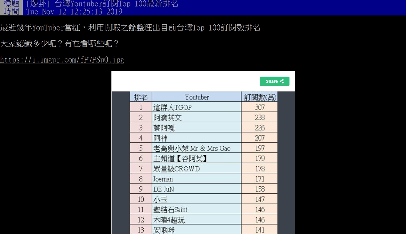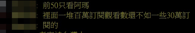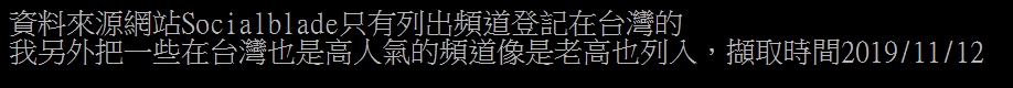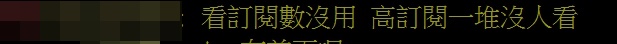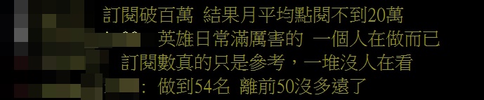 鄉民將此排名分享到PTT後,立刻引起熱烈討論,紛紛跳出來推自己喜歡的youtuber,藉機拉抬聲勢,不過也有許多人指出,「看訂閱數沒用,高訂閱一堆沒人看」、「訂閱破百萬,結果月平均點閱不到20萬」、「裡面一堆百萬訂閱觀看數還不如一些30萬訂閱」,由此可見訂閱僅能提供參考,點閱率才是觀眾喜愛的真正指標。