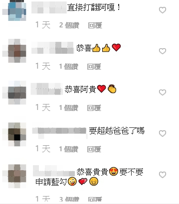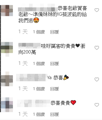另外,IG貼文中也神秘透露「阿爸阿母說100萬的禮物快做好了,下禮拜就會公布了喔!!!(期待)」。桃貴粉絲人數突破百萬,令許多網友也在該篇貼文下開心留言,「恭喜貴貴!」「直接打翻阿嘎!」「要超越爸爸了嗎」「因為你值得」「恭喜貴貴,愛你」「哇好厲害的貴貴,衝向200萬」,還有粉絲期待表示「恭喜老爺賀喜老爺~準備妹妹的IG蔡波能的給我們追」。