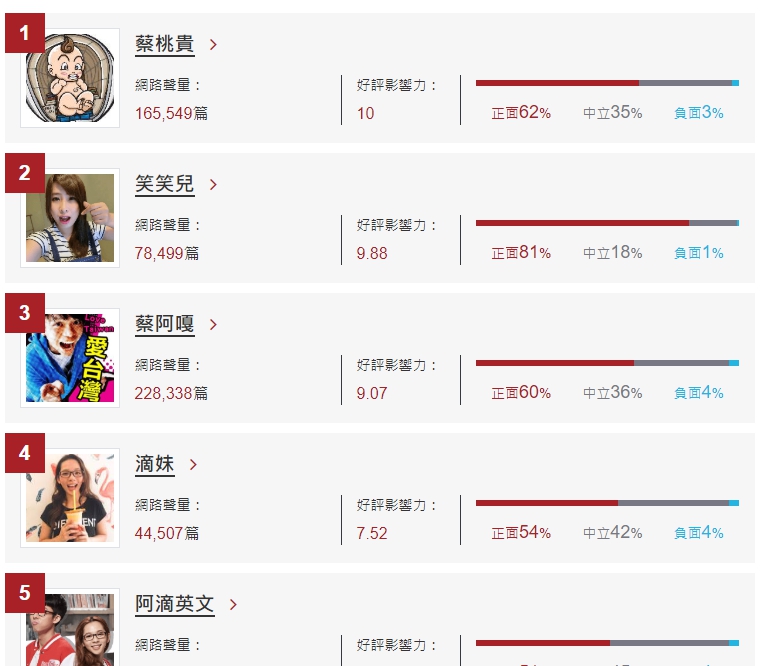 然而超人氣的蔡桃貴不只是《數位時代》台灣百大網紅人氣票選冠軍,目前更是《網路溫度計》統計「Youtuber好評影響力」冠軍,該評選是「根據網路聲量與網友語意情緒,以數值呈現分析對象在主題內的能見度與網友評價」,蔡桃貴網路聲量達到165549,甩第二名八萬多。