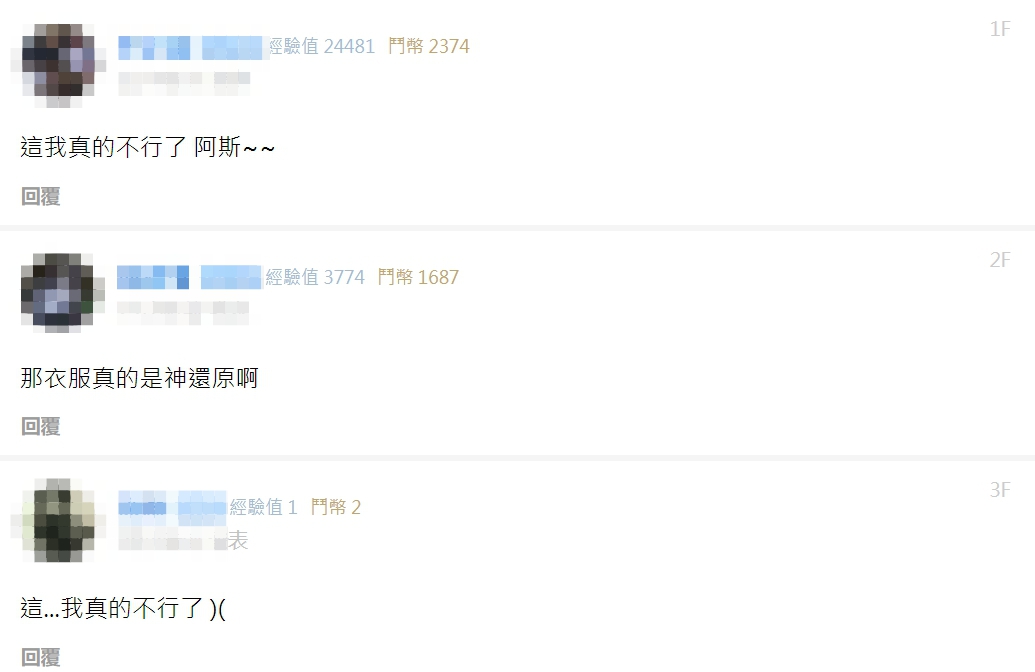 這段影片隨後也被網友擷取片段,上傳到知名電競影音社群媒體「遊戲大亂鬥」,引起網友一陣熱議,紛紛留言:「這也太晃了吧333」、「笑容蠻可愛的」、「頭都暈了030」、「這個真的讓人暈了」、「這我真的不行了,阿斯~~」、「那衣服真的是神還原啊」、「天啊!! 身材好好啊 快不行了」、「這太刺激了吧!!!XDD」。